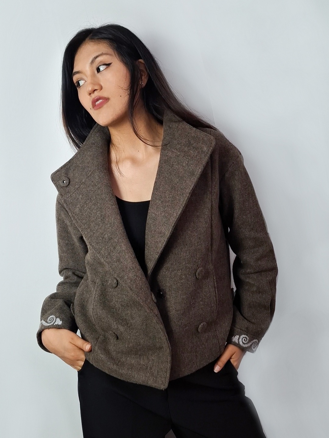 Confeccionada en paño de textura suave y estructura firme, su silueta de inspiración sastre y doble botonadura aporta carácter y presencia. Los detalles en las mangas evocan formas ancestrales.